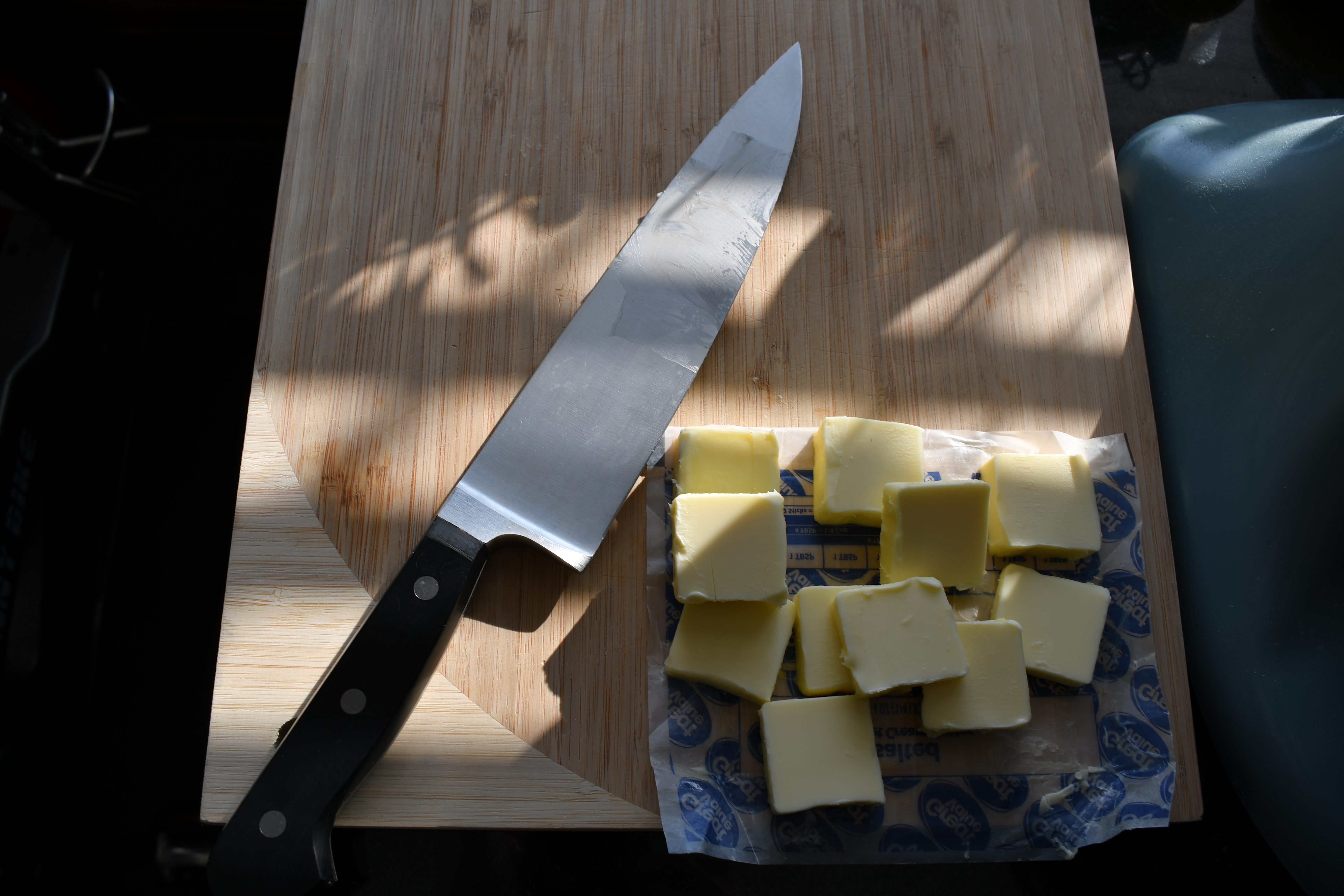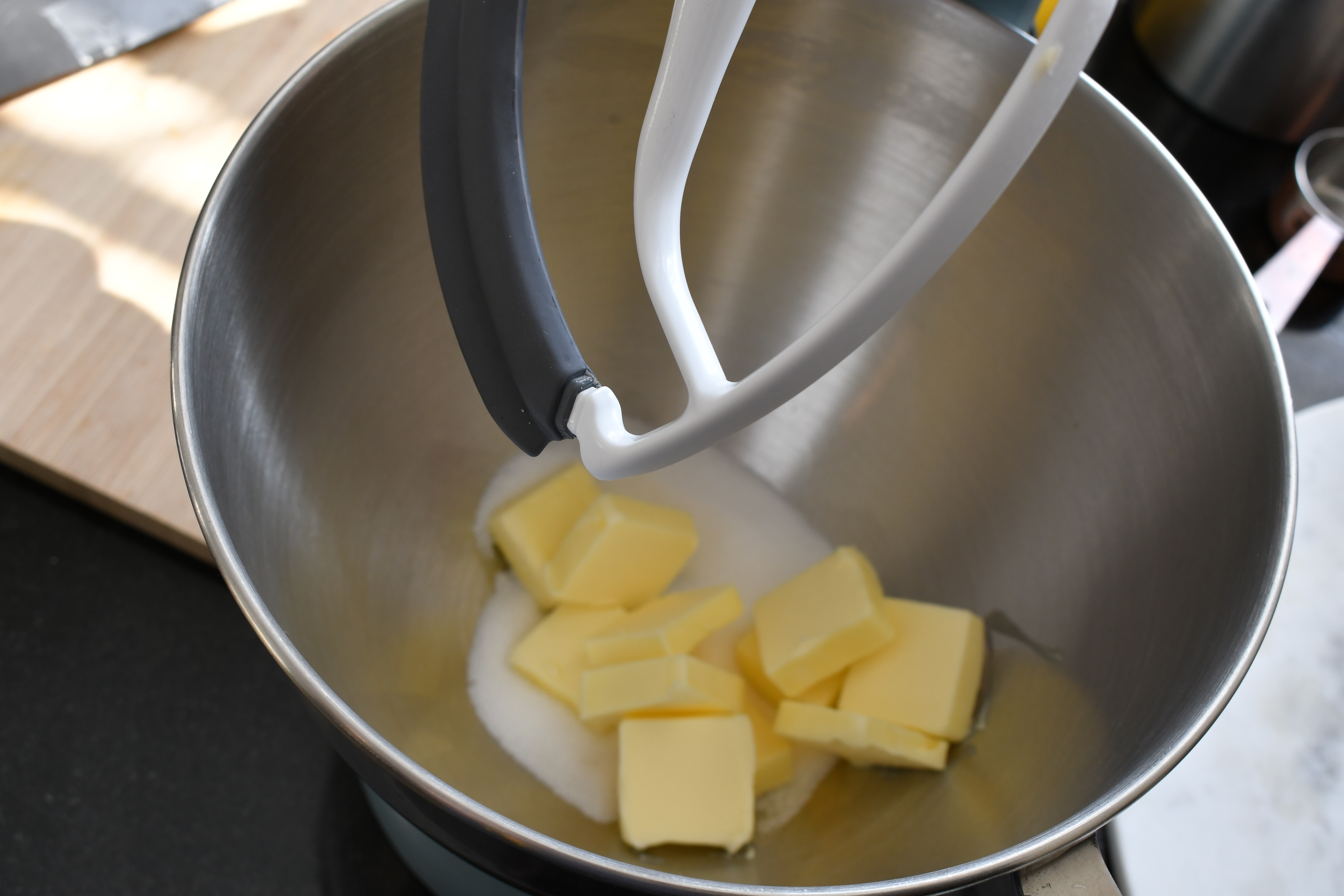 • Cream together on medium speed the unsalted butter and sugar until it has a whipped consistency and looks pale yellow.