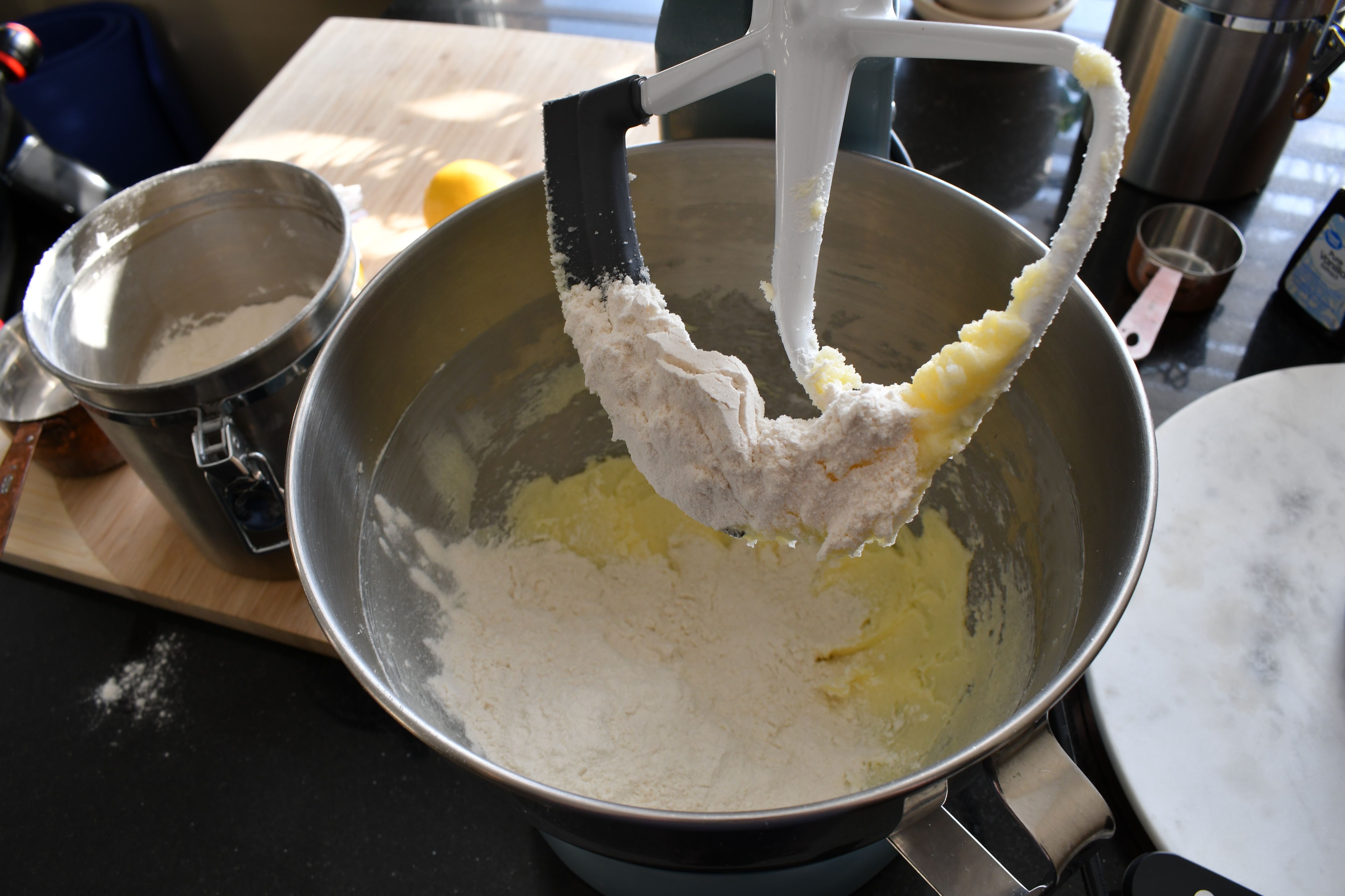 • Change the mixture’s setting to low and add the flour, salt, and lemon juice.