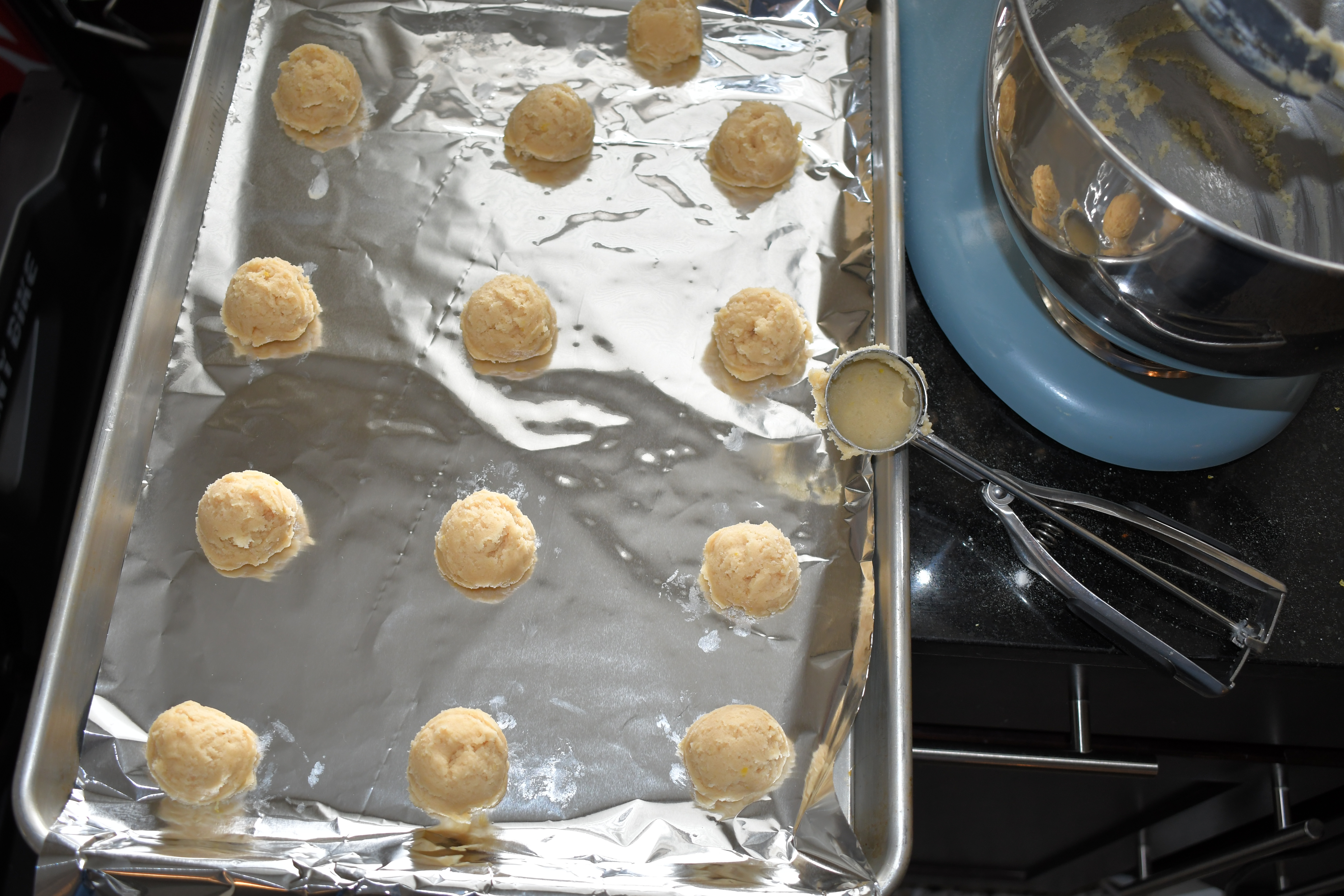 • Using a baking sheet lined with foil and a cookie scoop, drop the dough about an inch and a half apart.